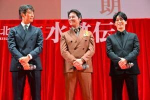 梁山泊の運命に大きな影響を与える、武を極めし孤高の師・王進役の佐藤は、棒術のアクションを見どころに。「刀を使った立ち回りの経験はあるけれど、棒術はなかなかない。亀梨さんは若いから体が動く…ホント悔しい!」とジェラシー。劇中で佐藤とのアクションシーンをこなした亀梨は、「思い切りこい!」と言われた佐藤の懐の広さに触れつつ、「浩市さんとは20年前に共演して、そこからの関係性があるので良かったです。これが“初めまして!”だったら思い切りいけなかったと思う」と感謝した。
